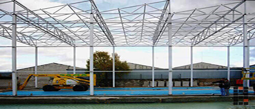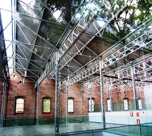 La cubierta en forma de diente de sierra está construida con vigas de celosía remachadas y sustentada por esbeltos pilares formados con perfiles de hierro. Al ser un conjunto de techos a un agua, permite el ahorro de energía ya que aprovecha la luz natural. Estas características lo convierten en una estructura ideal para industrias de manufacturas.
