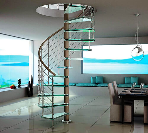 Las escaleras caracol pueden variar según el uso del material, como madera, vidrios o pintadas del color de su elección y combinados con barandas de acero inoxidable o madera, entre otros. Son utilizadas en exteriores e interiores.